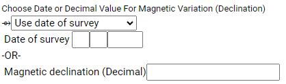 Almost all surveys have a date when it was completed. This date is used to calculate the magnetic declination at the time of a survey. This is caused by the wandering magnetic field of Earth, but we can calculate it. Enter the survey date into the date box. If you happen to know the magnetic declination, you can choose “use decimal declination” from the dropdown and enter it into the Decimal magnetic declination box. You do not need to know this, however, as SurveyPlotter will calculate it from your survey date. We suggest using the date, rather than guessing a declination.