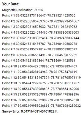 Below the quick view of your map, you will see the calculated magnetic declination, previously discussed, each of your GPS points corresponding to your metes (each point is listed), and your survey error, which shows you the distance between your first point and your last point (closing your perimeter). If this number is large, you might have entered something incorrectly in your mete list. In this example, our survey closed very well. In our experience, we like to see errors less than 1 foot, however old or difficult surveys might have larger amounts of error.